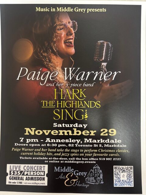 Middle Grey Arts & Heritage present Paige Warner and her band on Saturday, November 29th at 7:00 p.m. at Annesley. Paige and her 3 piece band take the stage to perform Christmas classics, current holiday hits, and jazzy spins on your favourite carols. Tickets ($35.00) are available online at www.middlegrey.events , at the door, or call 519-997-2727