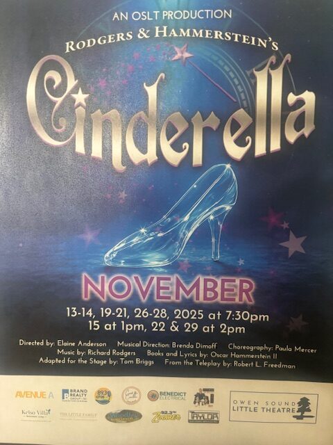 Owen Sound Little Theatre presents Rodgers & Hammerstein’s Cinderella on November 13-14,19-21,26-28, 2025 at 7:30 p.m. November 15 at 1:00 p.m., Nov. 22 & 29 at 2:00 p.m. at The Roxy Theatre. Get your tickets at roxytheatre.ca