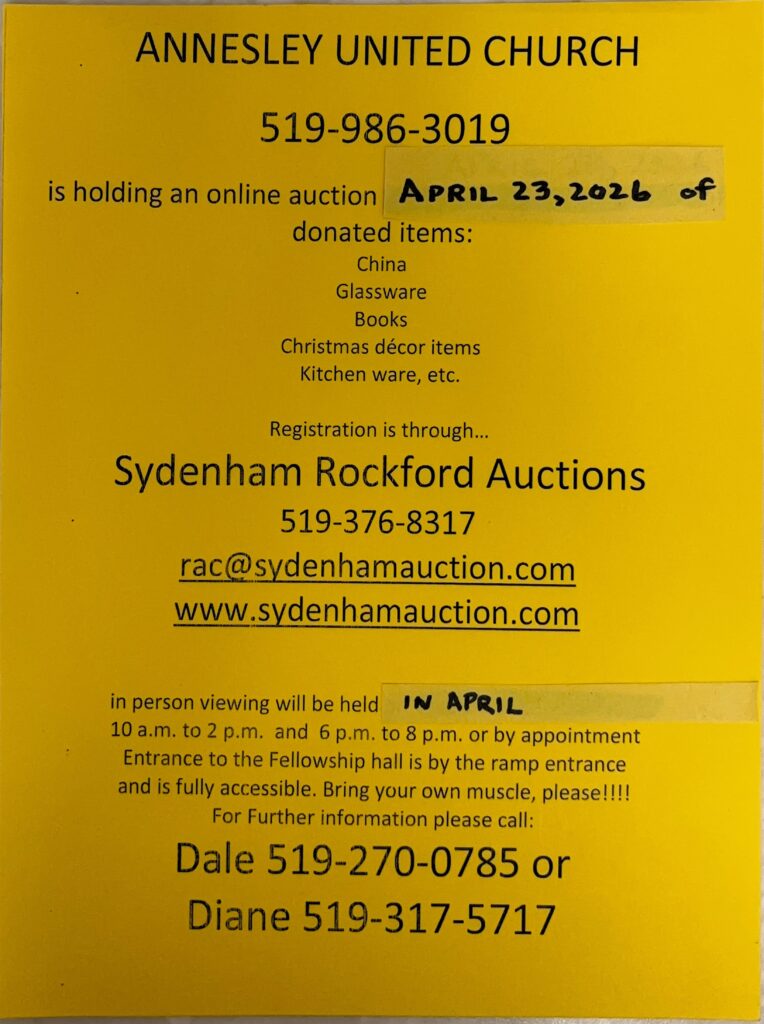 Our Online Auction will be held on Thursday, April 23rd. We will accept donated items into the lower level until the first week in April, then the information and photographs will be sent to Sydenham Auction for viewing online. Submission forms can be picked up at the office, or download a form HERE: